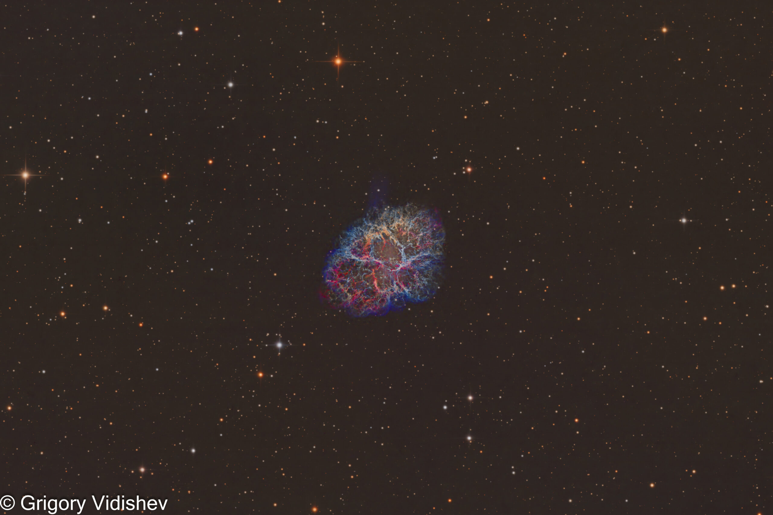 The Crab Nebula (catalogue designations M1, NGC 1952, Taurus A) is a supernova remnant and pulsar wind nebula in the constellation of Taurus. The common name comes from a drawing that somewhat resembled a crab with arms produced by William Parsons, 3rd Earl of Rosse, in 1842 or 1843 using a 36-inch (91 cm) telescope. The nebula was discovered by English astronomer John Bevis in 1731. It corresponds with a bright supernova observed in 1054 C.E. by Mayan, Japanese, and Arab stargazers; this supernova was also recorded by Chinese astronomers as a guest star. The nebula was the first astronomical object identified that corresponds with a historically observed supernova explosion. |