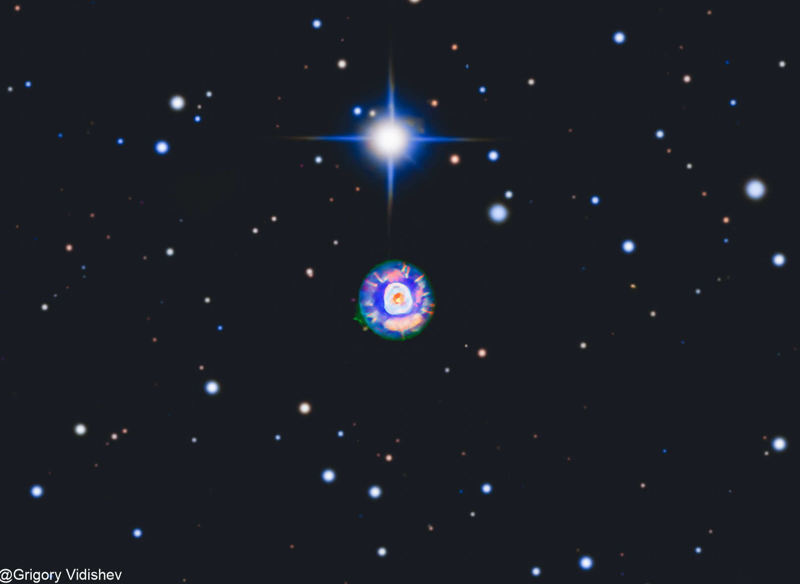 NGC 2392 Eskimo Nebula is small but bright object. It is difficult to process and acquire. You would need a long focus large aperture instrument. The Eskimo Nebula (NGC 2392), also known as the Clown Face Nebula, Lion Nebula, or Caldwell 39, is a bipolar double-shell planetary nebula (PN). It was discovered by astronomer William Herschel in 1787. The formation resembles a person’s head surrounded by a parka hood. It is surrounded by gas that composed the outer layers of a Sun-like star. The visible inner filaments are ejected by a strong wind of particles from the central star. The outer disk contains unusual, light-year-long filaments. NGC 2392 lies about 6500 light-years away, and is visible with a small telescope in the constellation of Gemini. At the center of NGC 2392, there is an O-type star (designated HD 59088[7]) with a spectral type of O(H)6f.